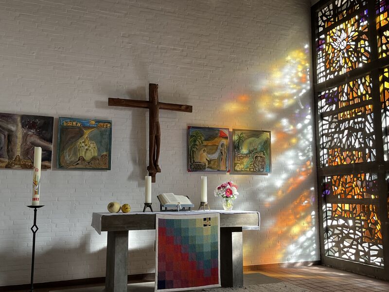 Das große Altarfenster von Sankt Andreas ist von Claus Wallner, Hamburg, gestaltet als Glas-Beton-Mosaik, hergestellt in der Künstlerwerkstatt "Manufactures des Glaces de Saint Gobain" in Frankreich. Das Glas-Beton-Mosaik ist modern gestaltet in größtenteils ungegenständlicher Form. Es wirkt besonders stark durch die künstlerisch vollendete Komposition von farbenfroh leuchtenden Glasflächen. Pfingstwunder und Schöpfungsmotiv sind miteinander verschmolzen. Das Symbol der Taube im oberen Drittel bildet die Schlüsselfigur als Darstellung des Heiligen Geistes.