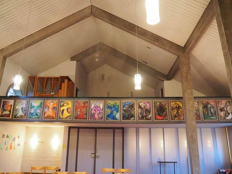 Das Auge wird aber auf den Crucifixus gelenkt, der die Mitte des ganzen Raumes darstellt. Er ist eine aus hiesiger Eiche getriebene Bildhauerarbeit von Friedrich Ehlermann aus Salzhausen (Meisterschüler von Prof. Pankok, Düsseldorf). Korpus und Kreuz sind aus einem Stück geschaffen.