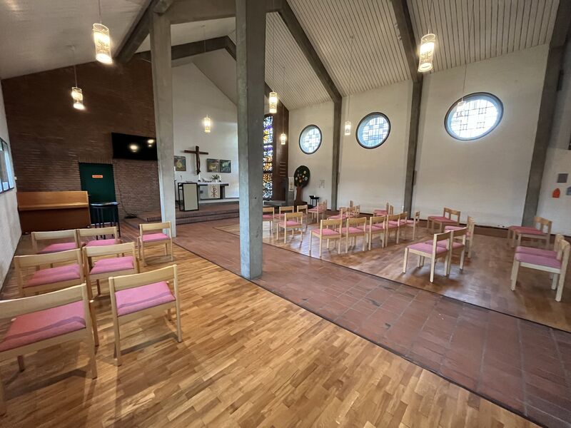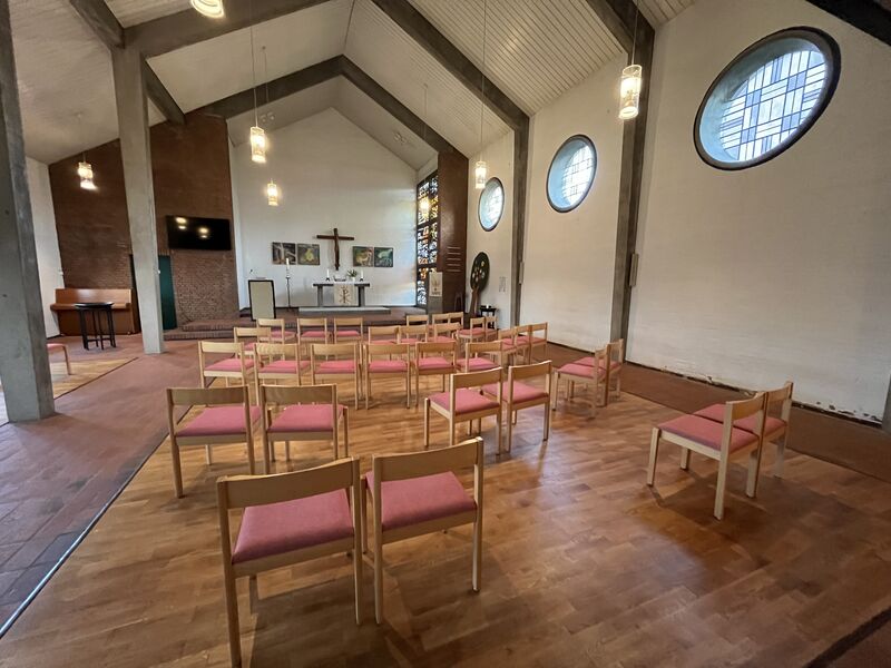 Der Innenraum mit Haupt- und Seitenschiff weist vor allem drei Bauelemente auf: Sichtbeton, Ziegel und Holz. Die mächtigen Pfeiler, der Altar und die Kanzel sind in dem früheren Betonwerk der Fa. Steinhage gefertigt worden. Die gesandeten, tiefgefugten Ziegel, die auch außen bei allen Gebäuden des Gemeindezentrums den niedersächsischen Charakter bestimmen, stammen aus Nijmegen/Holland.